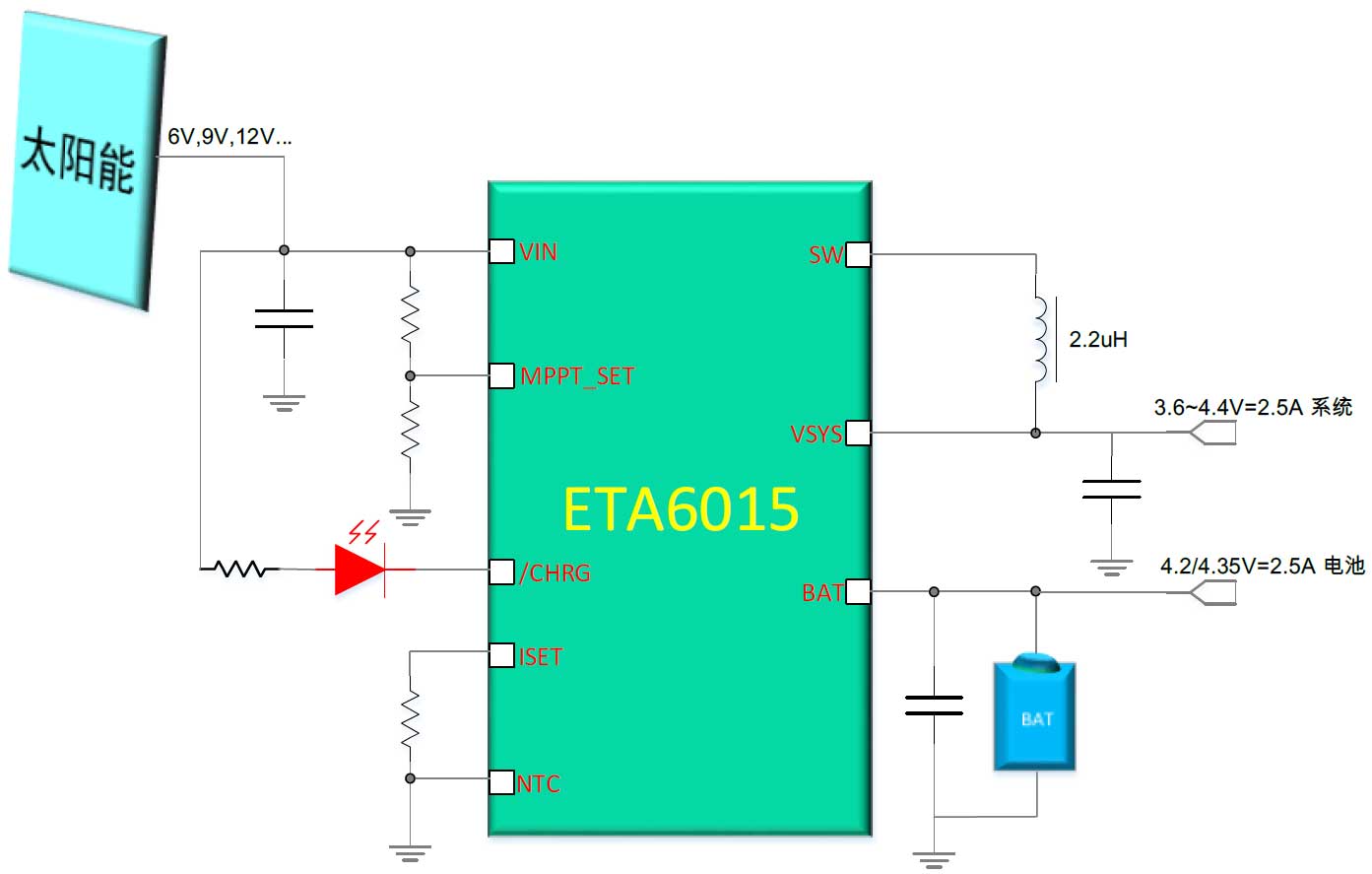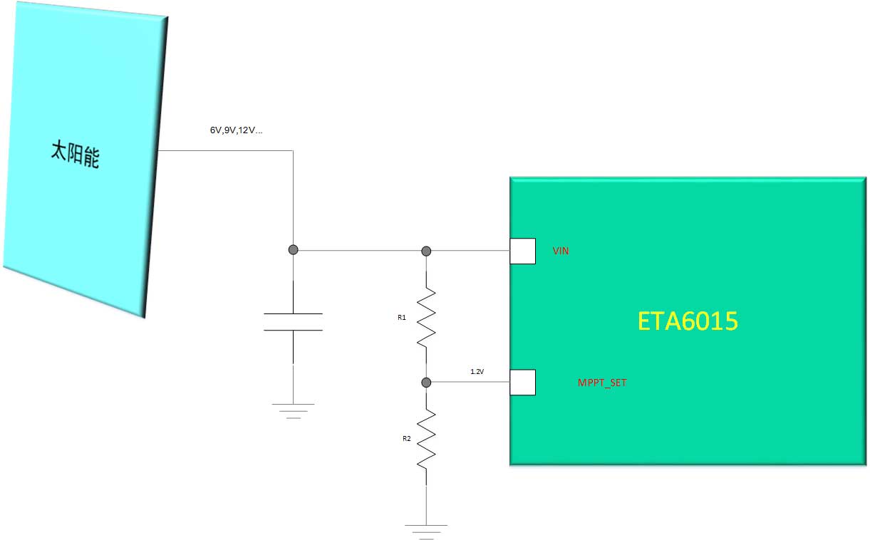 与传统的线性或开关充电IC有所区别,ETA6015针对太阳能供电进行了优化,其独有MPPT_SET功能,用于设定太阳能最大跟踪点,这对于那些在5~20w,MPPT电压在6~12V以内的太阳能电池板来说,选用超高集成度且内置功率管的ETA6015进行充电,显得非常有优势!