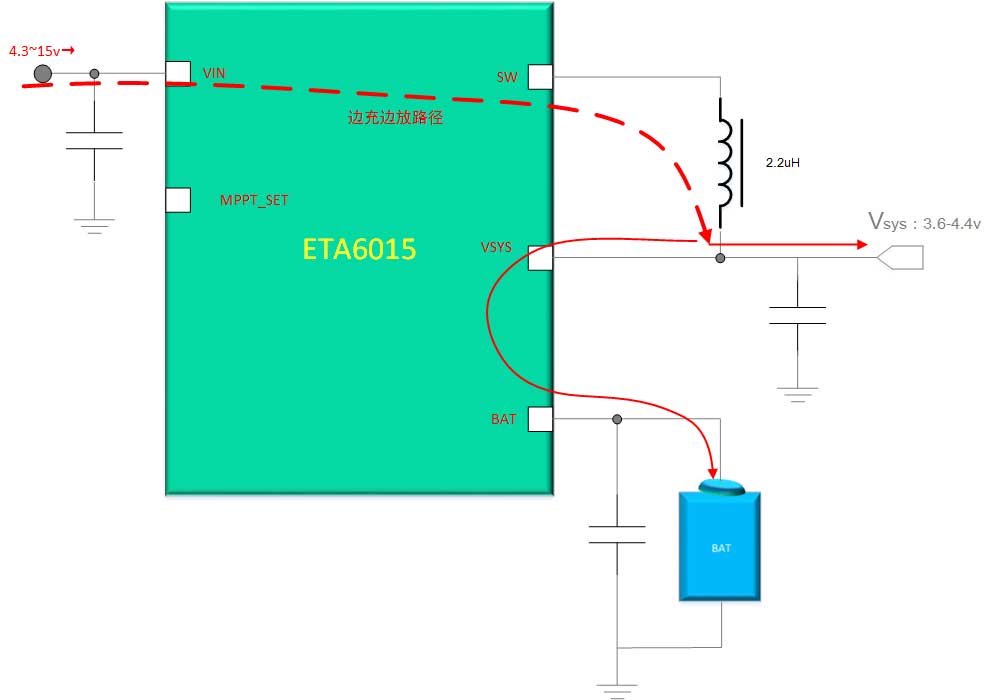 除了支持太阳能输入外,ETA6015还是一颗真正意义上的开关型充电IC,不仅如此,其还内置了电源动态路径管理,能够最大化的优先保证Vsys系统供电。如下图,当输入能源Vin足够稳定和强大时,则电能从Vin进行开关BUCK工作,在VSYS处耦合变成平稳的直流电压,一边给系统VSYS供电,多余能量,则通过VSYSóVBAT的内部双通功率管,给到VBAT电池端对电池进行充电: