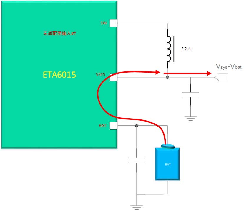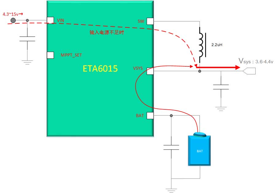 为了最大化的确保系统供电的可靠,确保系统供电平稳和可靠。当输入电源电压跳变、电源不足或者稳定性不够时时,这在传统的充电IC中,可能会遇到系统不稳、切换延迟甚至导致系统重启的情况产生。为了杜绝这种情况,ETA6015在VSYSóVBAT之间内建了超低阻抗的双向管,当输入电源不足以为Vsys提供足够强劲的负载时,电源将实施从BAT端到Vsys的补偿,确保系统可靠性和稳定。