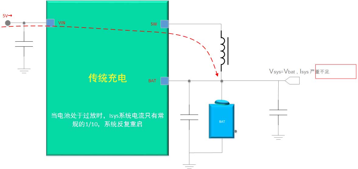 有别于传统的线性充电IC和开关型充电IC,ETA6015考虑了所有充电IC上可能存在的问题而针对性的进行了优化。我们知道,传统的线性或开关型充电电路可能会非常简单,但常常未能顾及在电池过放时产生的涓流充电,而导致系统反复重启的问题。如下图,是传统同步开关型充电IC的拓扑图,当我们把系统负载直接接驳在电池端时,如果电池处于过放电的状态,譬如只有2.5V,则开关输入电流可能只有传统充电电流的C/10,譬如只有100mA;则这时候对于那些具备数字电路的系统,如MCU,CPU等可能会瞬间启动,其或其控制的负载系统可能瞬间峰值超过该涓流充电电流,导致系统不断地重启。
